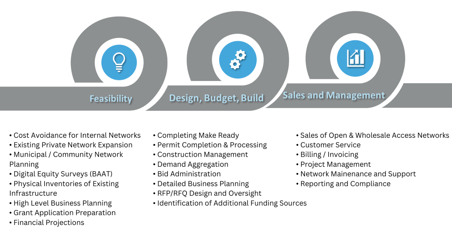 At ECC Technologies, we specialize in guiding local, regional, and state governments through this intricate process, offering a comprehensive roadmap that transforms the dream of broadband into a reality. With a proven methodology our expertise spans across the key components necessary for a successful broadband initiative, including: