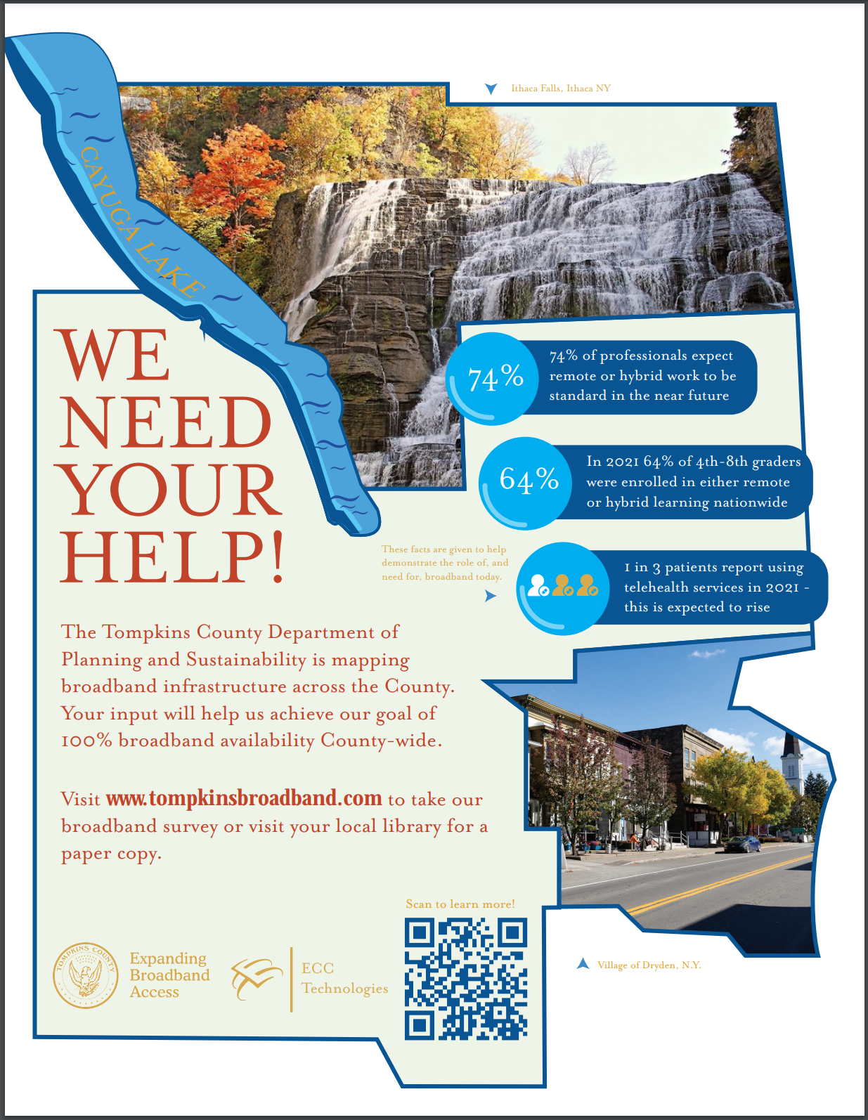 The Tompkins County NY Department of Planning and Sustainability (DPS) has engaged Penfield, NY-based ECC Technologies, Inc. (ECC) to complete a comprehensive broadband-focused project! The ultimate goal is to provide 100% broadband coverage for the County!